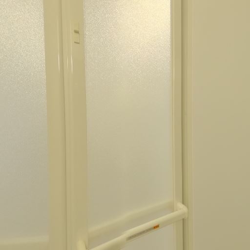 浴室ドアの状態(確度70%):不透明(すりガラス調)の引戸もしくは開き戸で、フレーム含めて破損は見られない。