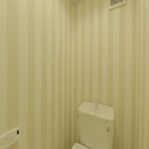 清潔感のある内装(確度70%):明るい色味のストライプ壁紙と白基調で統一され、汚れや傷は目立たない。