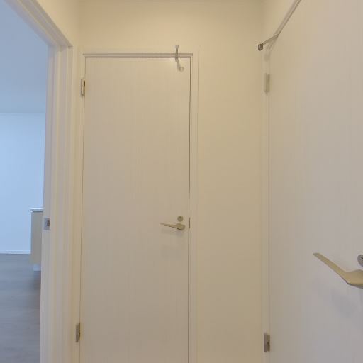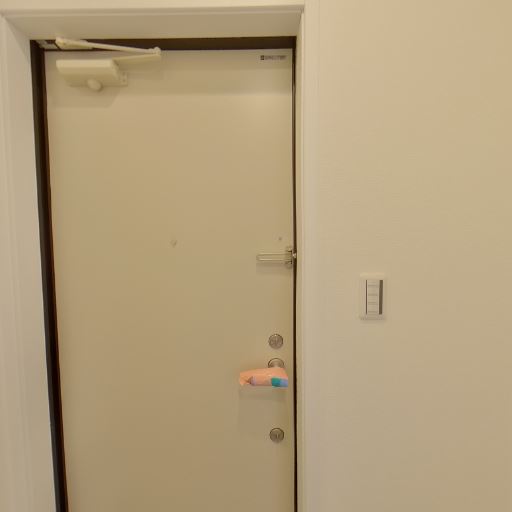 玄関ドアと設備の状態(確度73%):室内側の玄関ドアは淡色で、ドアクローザーやドアスコープ、内側サムターンが確認でき、目立つキズや錆は見当たらない。