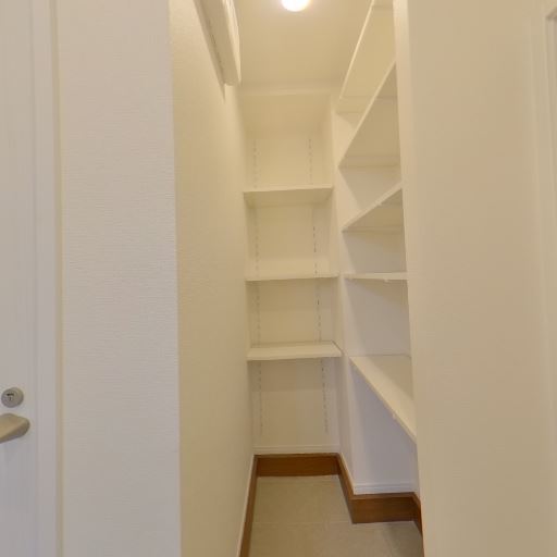 土間収納(シューズインクローゼット)の存在(確度86%):玄関横に可動棚のある土間スペースがあり、奥行きがあって収納量が確保できる。照明も設置。