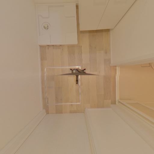 床の状態と点検ハッチ(確度80%):フロアは明るい木目で、洗面室床に点検ハッチがある。洗濯機パンも近くに見える。