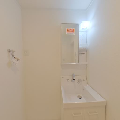 独立洗面台とミラー収納(確度86%):コンパクトな独立洗面台があり、ミラーキャビネットとサイドの操作パネルが見える。収納は下部扉もあり日用品をしまえそう。