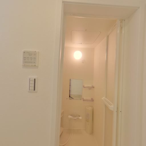 浴室が隣接(確度88%):洗面室から直接出入りできる浴室の開口が確認できる。照明や浴槽の一部、鏡・手すりも見える。