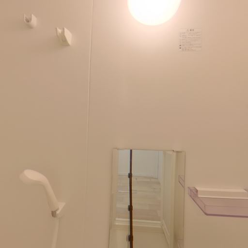 収納・物置き(確度70%):壁面に小物棚とタオル掛け(バー)がある。