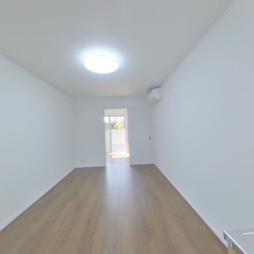 居室は細長いワンルーム形状(確度83%):木目床の細長い空間で、奥にバルコニーへの開口とエアコンが見える。中央天井照明が設置済み。