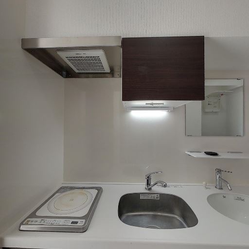 ミニキッチンと設備(確度90%):一口IHコンロ、シンク、レンジフード、上部収納、照明付きのコンパクトなキッチン。単身向けの仕様に見える。