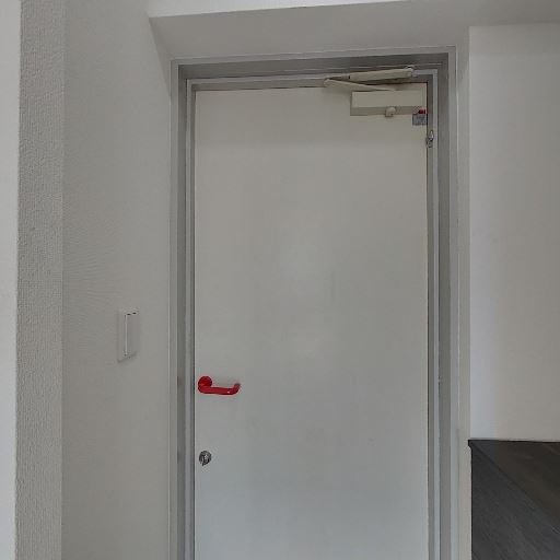 玄関ドアと共用部側の仕様(確度70%):内側にドアクローザーと非常時用の赤いドアハンドルカバーが見える。防犯・防火を意識した玄関扉と思われる。
