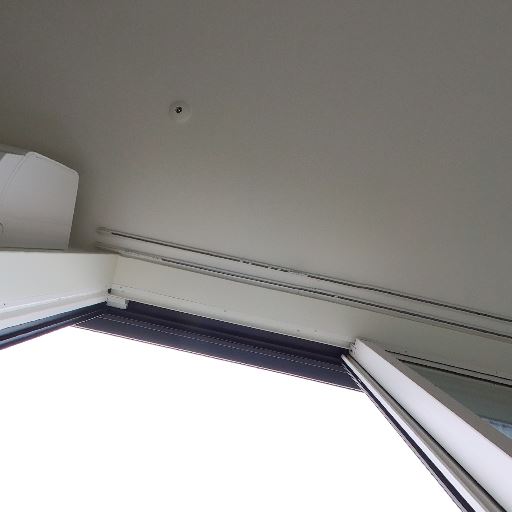 浴室乾燥・物干しバーあり(確度90%):天井に浴室乾燥機の通気口と物干しバーが設置されている。