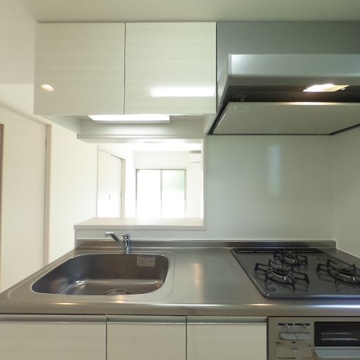 キッチン設備が比較的充実している(確度95%):システムキッチンにシンク、二口コンロ、レンジフード、上部収納が備わっているのが確認できる。日常の自炊には必要な設備が一通り揃っているように見える。