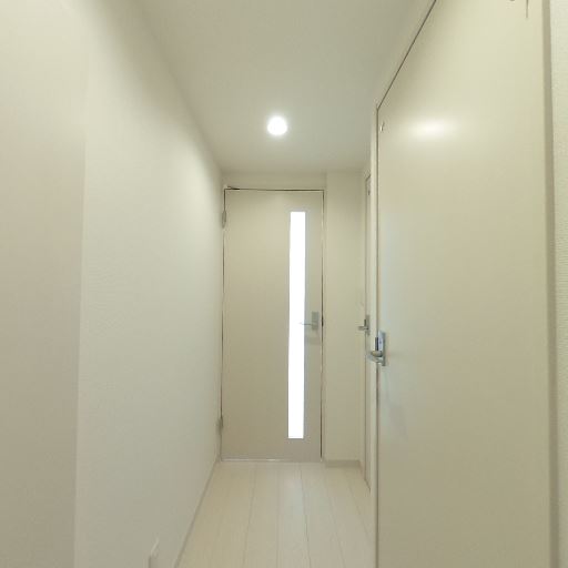 室内は明るく清潔感のある内装(確度88%):白系の壁・建具・床材で統一され、ダウンライトと扉の縦スリットからの採光により全体が明るく見える。