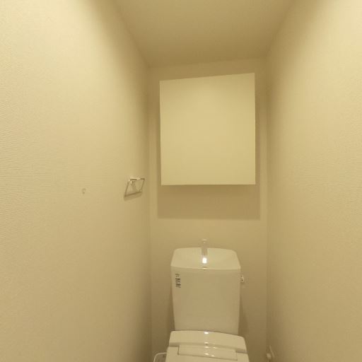上部収納がありトイレ用品を隠してしまえる(確度96%):便器上部の壁面に吊戸棚があり、トイレットペーパーや掃除用品を収納できる構成に見える。