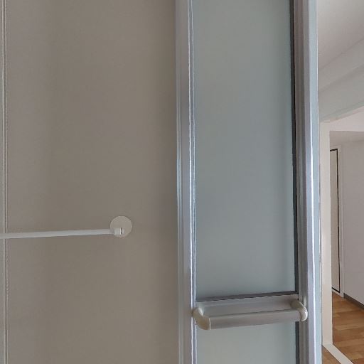 • 物干し設備がある(確度91%):天井側に物干しフック・金具が複数見え、バルコニーで洗濯物を干す前提の設備が整っている。