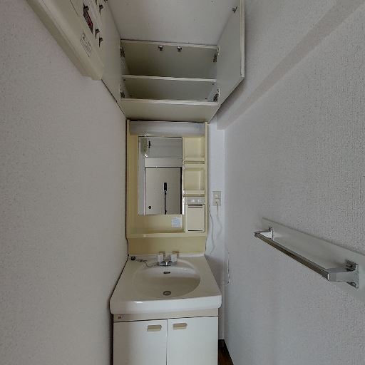 • 独立洗面台とミラー収納あり(確度94%):洗面スペースに独立洗面台が設置されており、鏡まわりに収納棚、さらに上部にも収納がある。日用品や洗面用具をまとめやすい構成に見える。