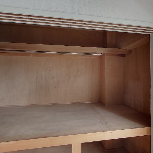 • 収納力のある押入れ(確度94%):壁一面近くに大きな押入れ収納があり、中段とハンガーパイプも確認できるため、衣類や寝具をまとめて収納しやすい。