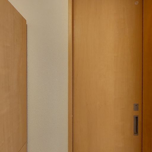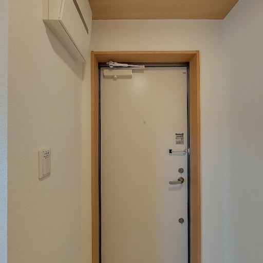 • 玄関ドアと防犯設備(確度74%):内開きの玄関ドアにドアクローザーとチェーン(またはドアガード)が見える。郵便受け口もあり、標準的な防犯仕様。