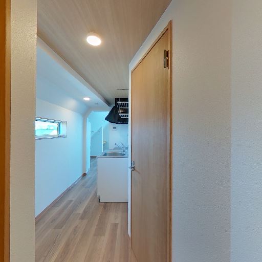 • 廊下奥にキッチンと採光窓(確度70%):玄関から続く廊下の先にキッチンがあり、横長窓から自然光が入っている。