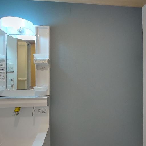 • 独立洗面台と鏡付き収納(確度86%):照明付きの洗面化粧台があり、鏡脇に小物棚とコンセントが見える。