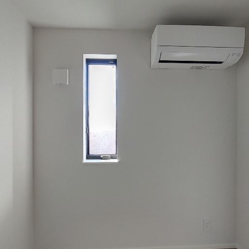 スリット窓とエアコン設置済み(確度90%):細長いスリット窓があり、上部に壁掛けエアコンが設置されている。