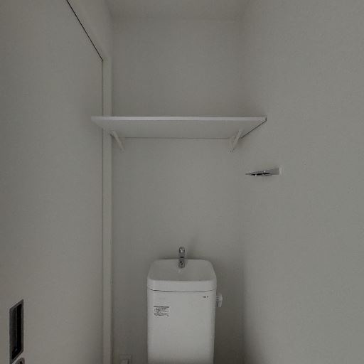 トイレ空間である(確度96%):便器、トイレットペーパーホルダー、棚、換気口が確認できる。