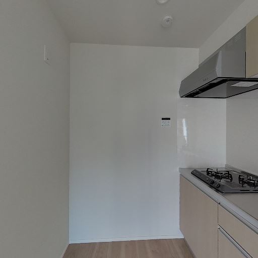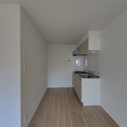 キッチンの配置と通路幅(確度72%):壁付けのシステムキッチンで、通路はやや細め。冷蔵庫置き場はキッチン奥側にありそう。