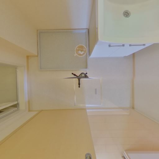 洗濯機置き場の存在(確度91%):床面に洗濯機パンと給水栓・排水口が設置されている。