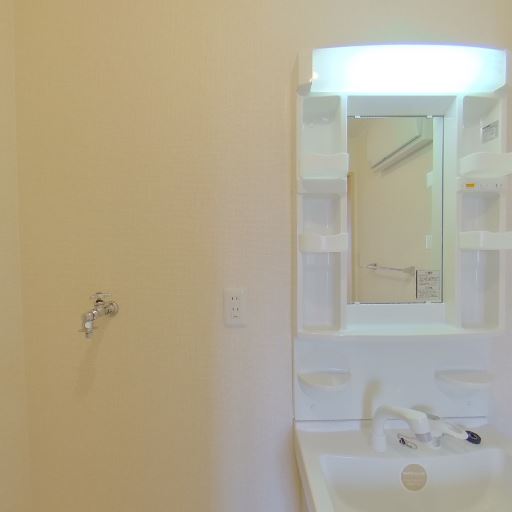 独立洗面台と収納付きミラー(確度86%):照明付きの独立洗面台があり、ミラー脇にボトル等を置けるポケット収納が複数ある。