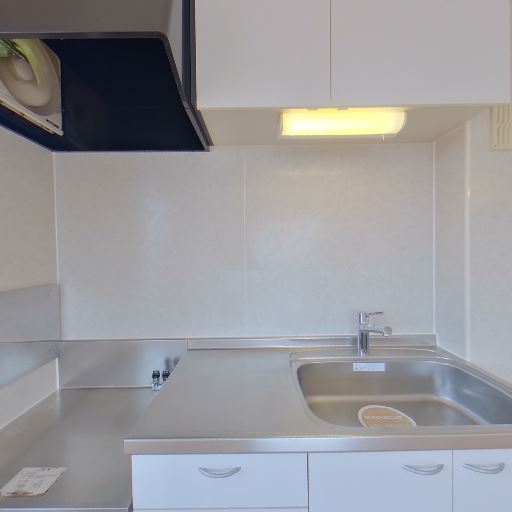 キッチンの状態と設備(確度80%):ステンレス天板とシンクが清潔感あり、壁面パネルで掃除もしやすそう。吊戸棚とレンジフードも設置。