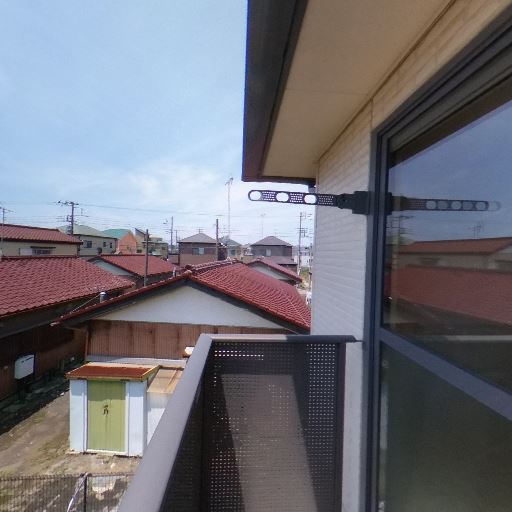 バルコニーの使い勝手(確度86%):手すり付きのバルコニーがあり、物干し金具が設置済み。床面も比較的きれい。