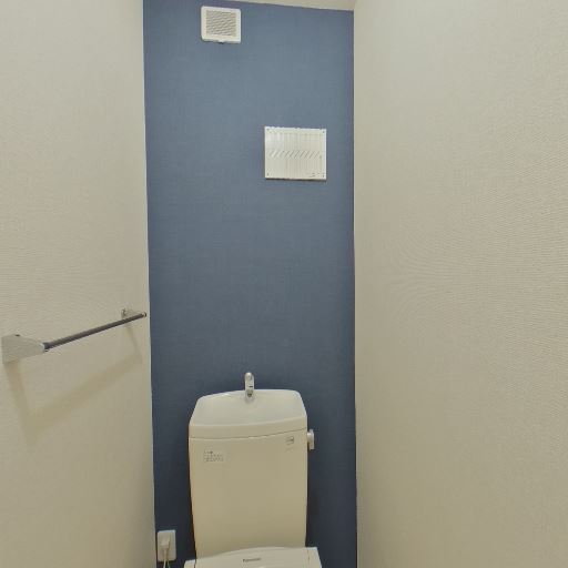 トイレの内装とアクセントクロス(確度82%):背面壁が濃いブルーのアクセントクロスで、他は明るい壁紙。落ち着いた雰囲気に見える。