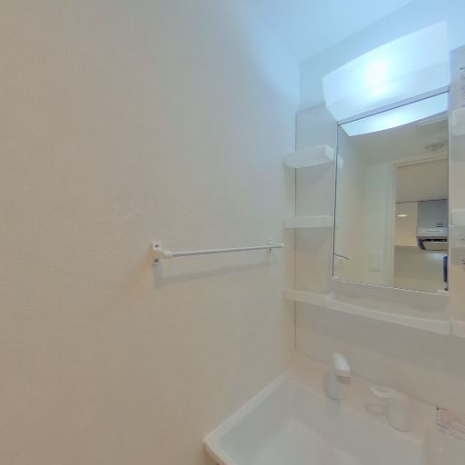 独立洗面台がある(確度95%):洗面ボウルと鏡、脇の収納棚が確認でき、身支度のしやすい独立洗面台が備わっている。