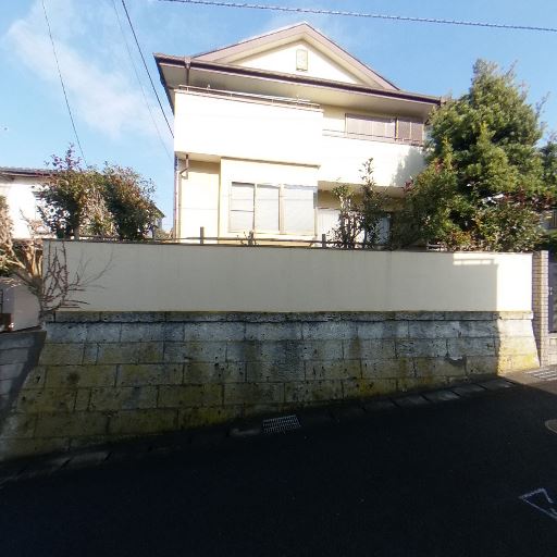 駐車スペースの確保(確度68%):敷地前にスロープ状のアプローチと道路との高低差があり、車の出し入れが可能に見える。周囲の住宅も駐車場付き。
