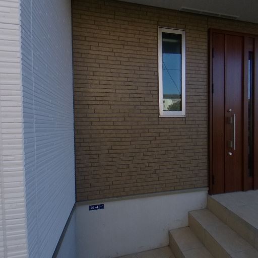 外壁・玄関ドアの新しさ(確度77%):外壁サイディングや玄関ドア、タイルがきれいで新築または築浅の印象。
