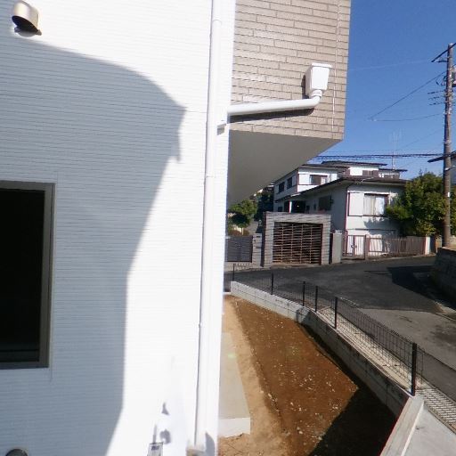 角地の新しめの戸建て(確度82%):L字の道路に面した角地で、建物外壁や設備が新しく見える。外構は未完成で土のままの部分がある。