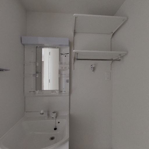 独立洗面台と収納棚(確度86%):洗面化粧台の上に鏡付きキャビネットがあり、横には可動棚が2段設置されている。洗面まわりの小物やタオルを置ける。