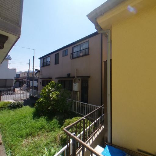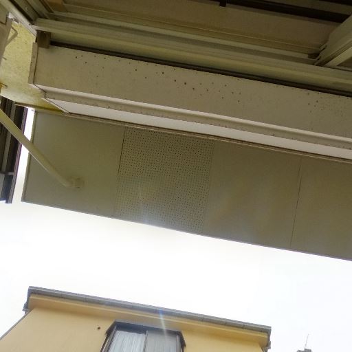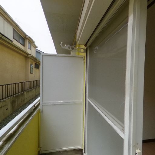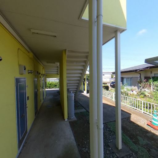 • 共用廊下と階段のある外部共用部(確度86%):黄色い外壁の前に屋根付きの共用廊下と階段が見える。各住戸の玄関ドアとメーターボックスが並ぶ集合住宅タイプのエントランス前と思われる。