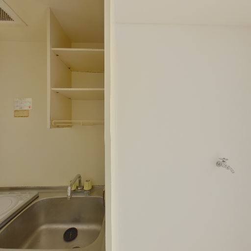 • 天井設備と照明(確度76%):天井に換気口(キッチン換気)と裸電球のソケットが見える。照明器具は未設置の可能性。