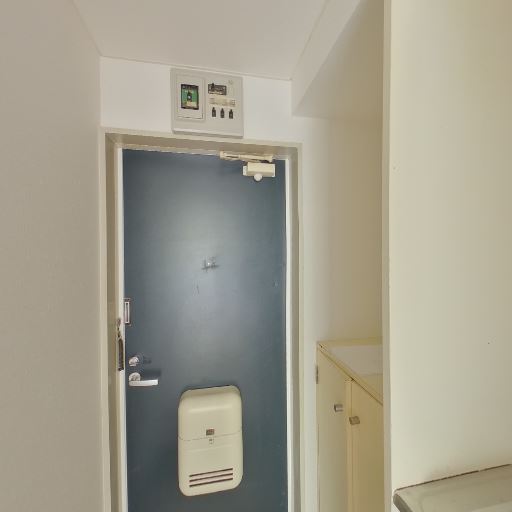 • 玄関扉と設備(確度84%):スチールドアにドアクローザーとポスト一体型。上部にブレーカー(分電盤)があり、玄関脇に下駄箱も見える。