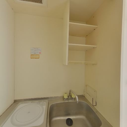 • ミニキッチンと収納棚(確度86%):1口IHコンロのミニキッチンと上部オープン棚がある。シンクはやや小さめ。