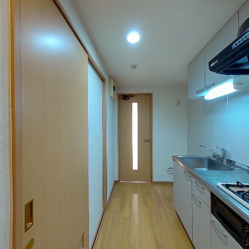 水回りが近接(確度78%):キッチン脇の引き戸の先に洗面台が見える。動線が短いレイアウト。