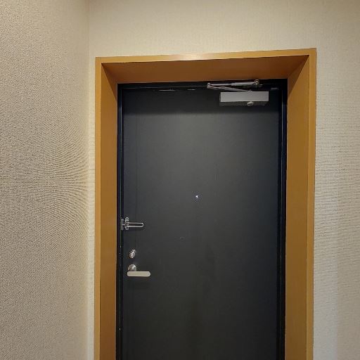 玄関ドアの状態と防犯性(確度78%):ダークカラーの玄関ドアで、ドアクローザー・チェーン(もしくは補助ロック)が確認できる。見た目は概ね良好で大きな傷は見当たらない。