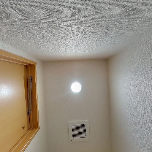 換気設備と照明(確度86%):天井に丸型照明と換気扇グリルが確認できる。窓は見当たらない。