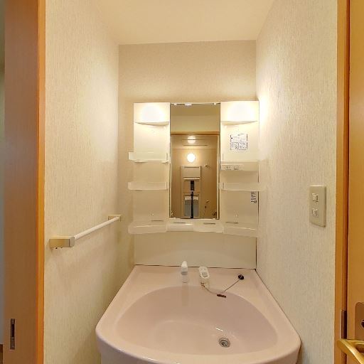 独立洗面台あり(確度90%):ミラーキャビネットと収納棚付きの独立洗面台が設置されている。