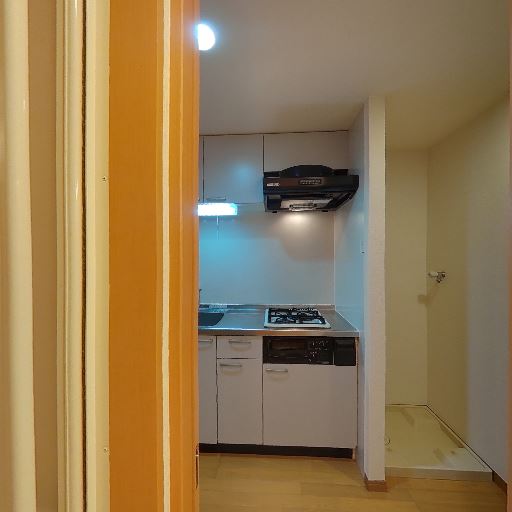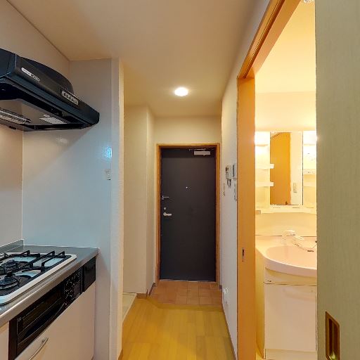 キッチンが近接(確度83%):脱衣・洗面スペースからキッチンが近くに見える間取り。2口ガスコンロとレンジフード、吊り戸棚あり。