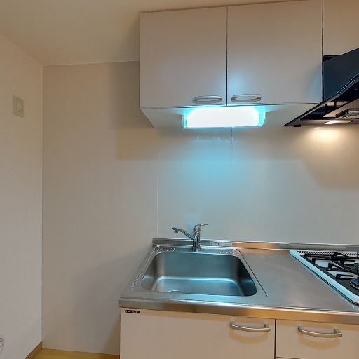 単身向けのキッチン設備(確度88%):シンクと2口ガスコンロ、上部・下部収納が確認できる。レンジフードも設置。サイズはコンパクト。