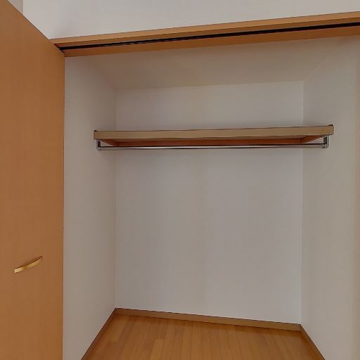 クローゼットの収納(確度86%):ハンガーパイプと上部棚のある奥行きのあるクローゼットが確認できる。扉は折れ戸タイプ。