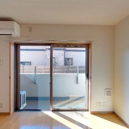 バルコニー・室外機の配置(確度75%):窓の外は腰高の手すり付きバルコニーで、エアコン室外機が設置済み。
