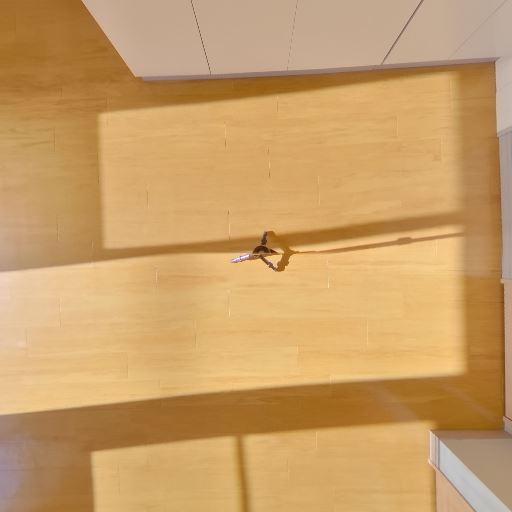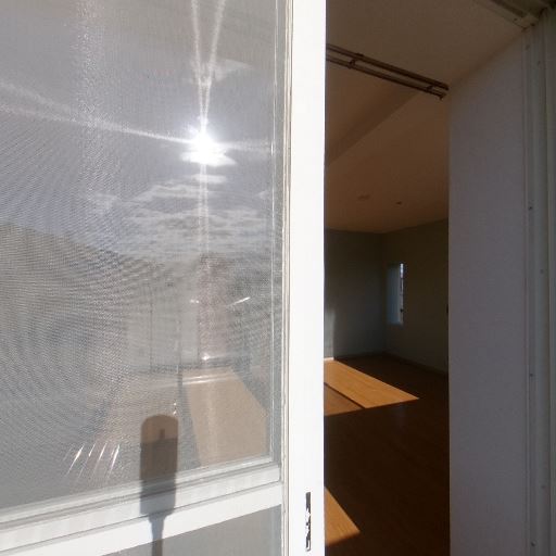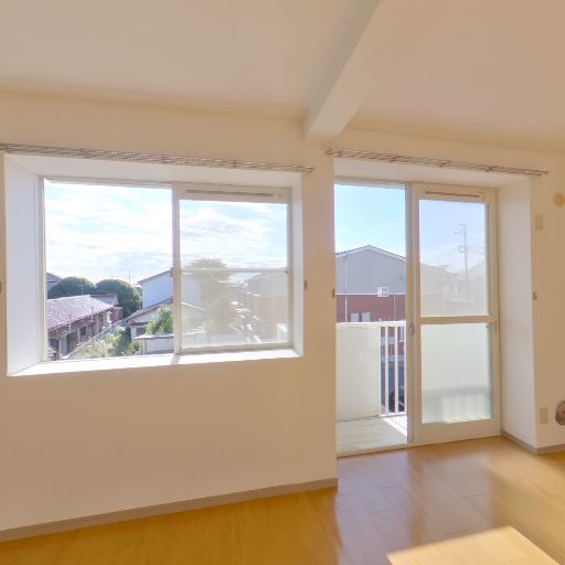 明るいリビング(確度92%):大きな窓とバルコニードアから日光がしっかり入り、室内がとても明るい。床に強い日射の影が出ている。