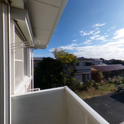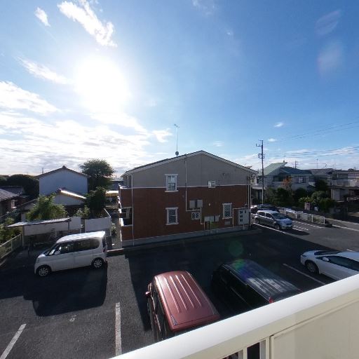 開放的な眺望と日当たり(確度86%):前面が駐車場と低層住宅で抜けがあり、強い日差しがバルコニーと室内に入っている。
