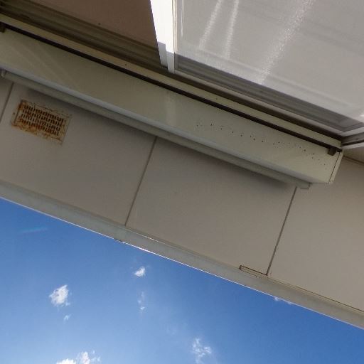 外壁・天井の軽い汚れ(確度67%):バルコニー天井や金具付近にサビ・汚れの跡が見える。