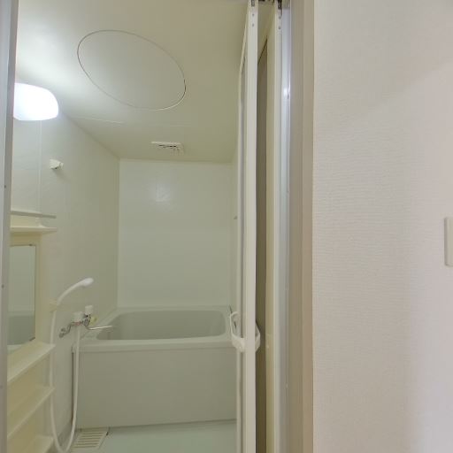 浴槽とシャワーの一体型ユニットバス(確度90%):浴槽・シャワー・壁面棚が一体のユニット仕様。清掃がしやすい印象。